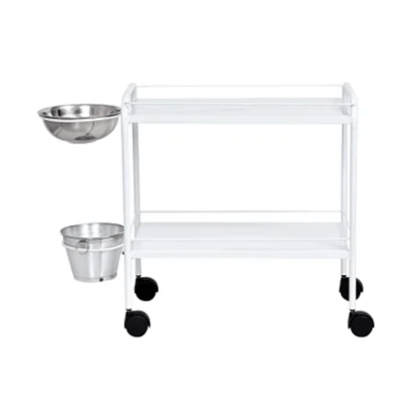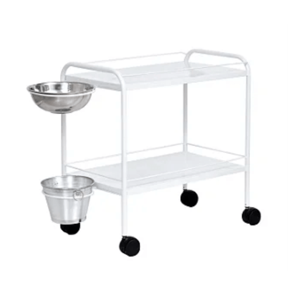 El carro para vendaje en pintura epoxi con balde y palangana de acero inoxidable tiene estructura tubular, tapa y repisa en acero inoxidable y está pintado en epoxi.